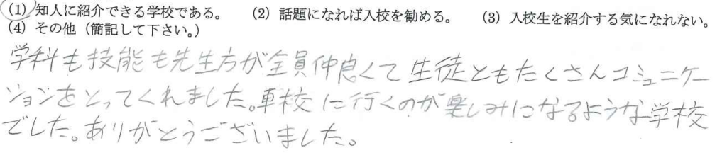 失敗した時にいろいろな先生方に励まされながら、教習できた事が、本当に良かったです。